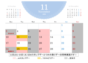 11月11日(火)、11月25日(火)はつかみ取り・Wスタンプ両方実施します!